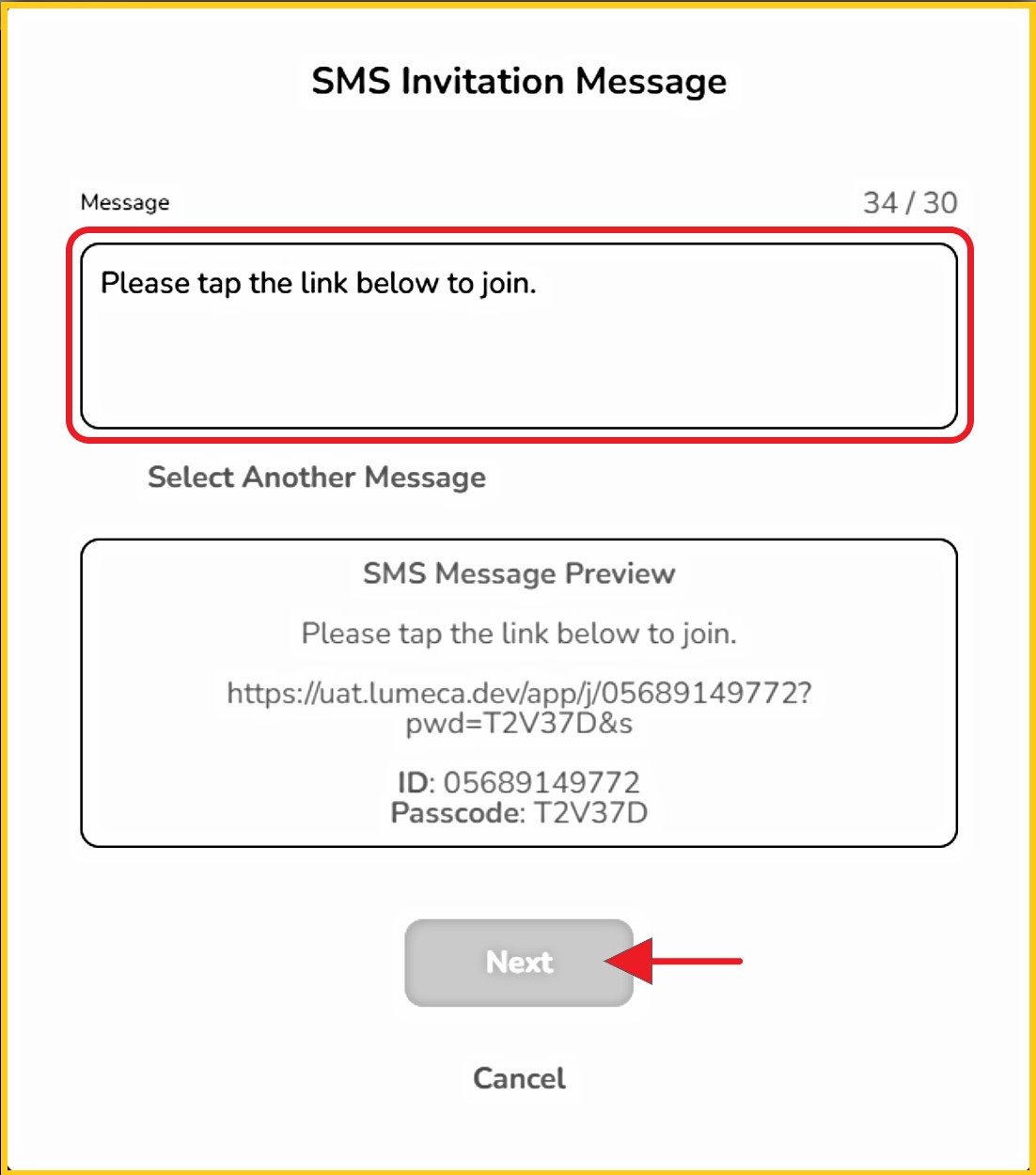 - Enter a message to the invitee (max 30 characters).