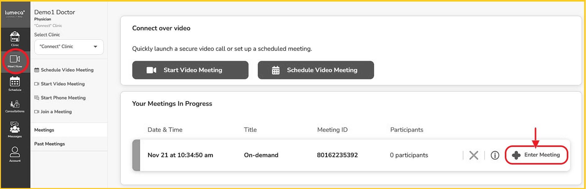 - The host and participants from the same virtual clinic may rejoin under "Meet Now" and "Your Meetings in Progress". The active meeting will appear and they simply "Enter Meeting" to rejoin.