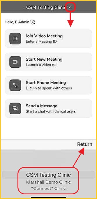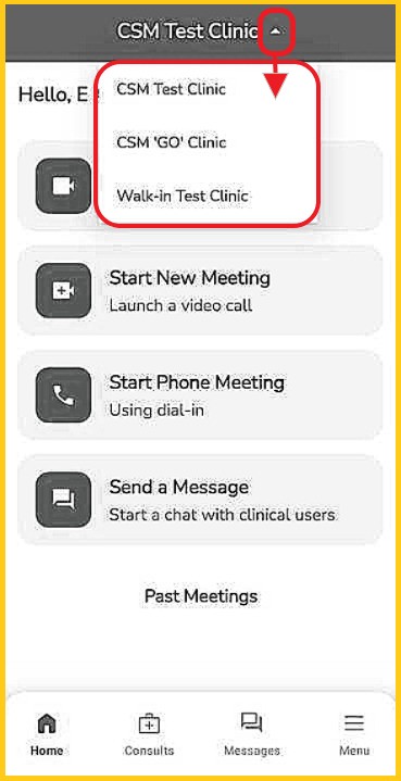 Click the drop-down arrow beside the clinic name at the top of the 'Home' screen, then choose your clinic.