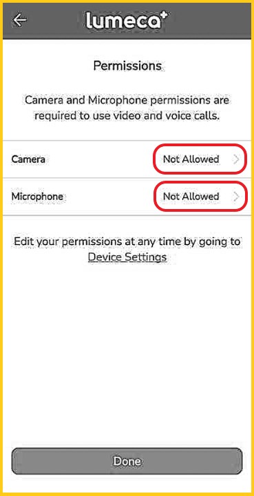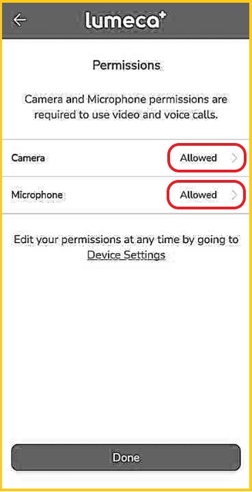 | - Make sure your microphone and camera are Enabled/Allowed under your ‘Device Settings’ for the ‘Lumeca Health' APP. |