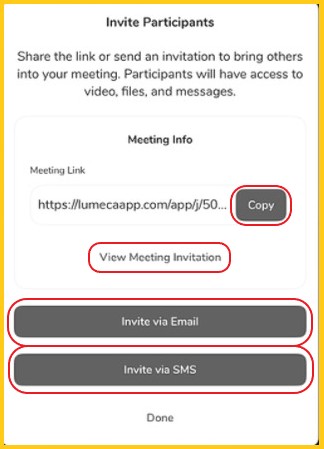 - 'Send Invitation via SMS' will send the Meeting Information by SMS text message. You must know your participant's cell number.