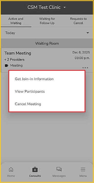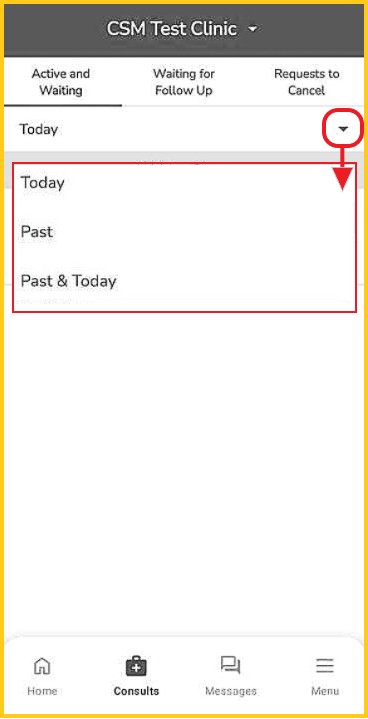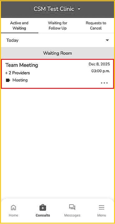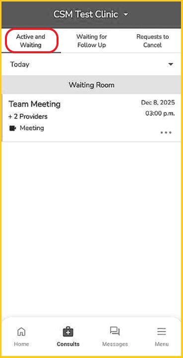 Step 1 - On the bottom of the ‘Home’ screen, click 'Consults'. You will be directed to the ‘Active and Waiting’ screen: