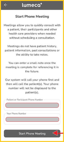 Step 3 - Enter the patient or participant's phone number and your phone number. Note: your number always remains hidden from the person being called.