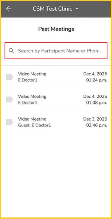 Your most recent video and phone meetings will display on the screen OR you may search using the ‘Search’ field at the top of the screen.