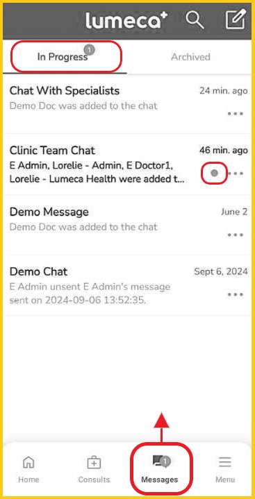 Step 1 - Click 'Messages' at the bottom of the screen. There are two sections: 'In Progress' and 'Archived'.