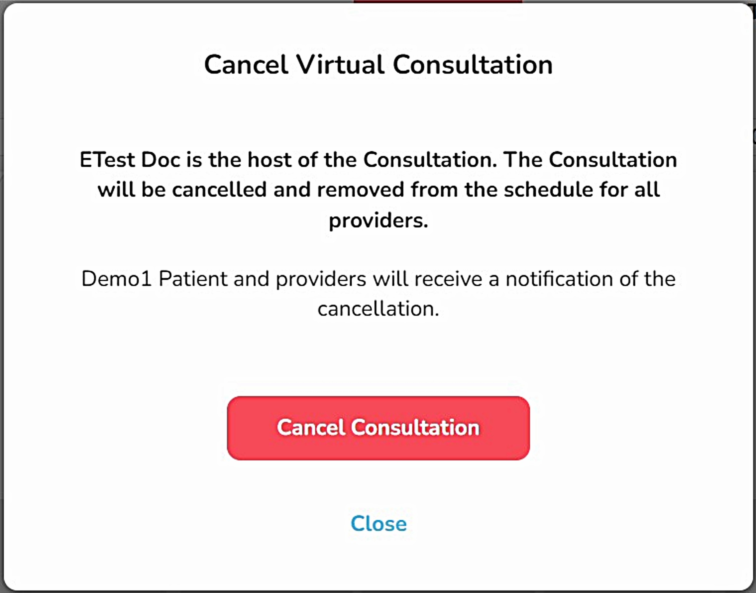 Step 5 - You will be prompted to confirm the cancellation. Review the message, then click 'Cancel Consultation'.