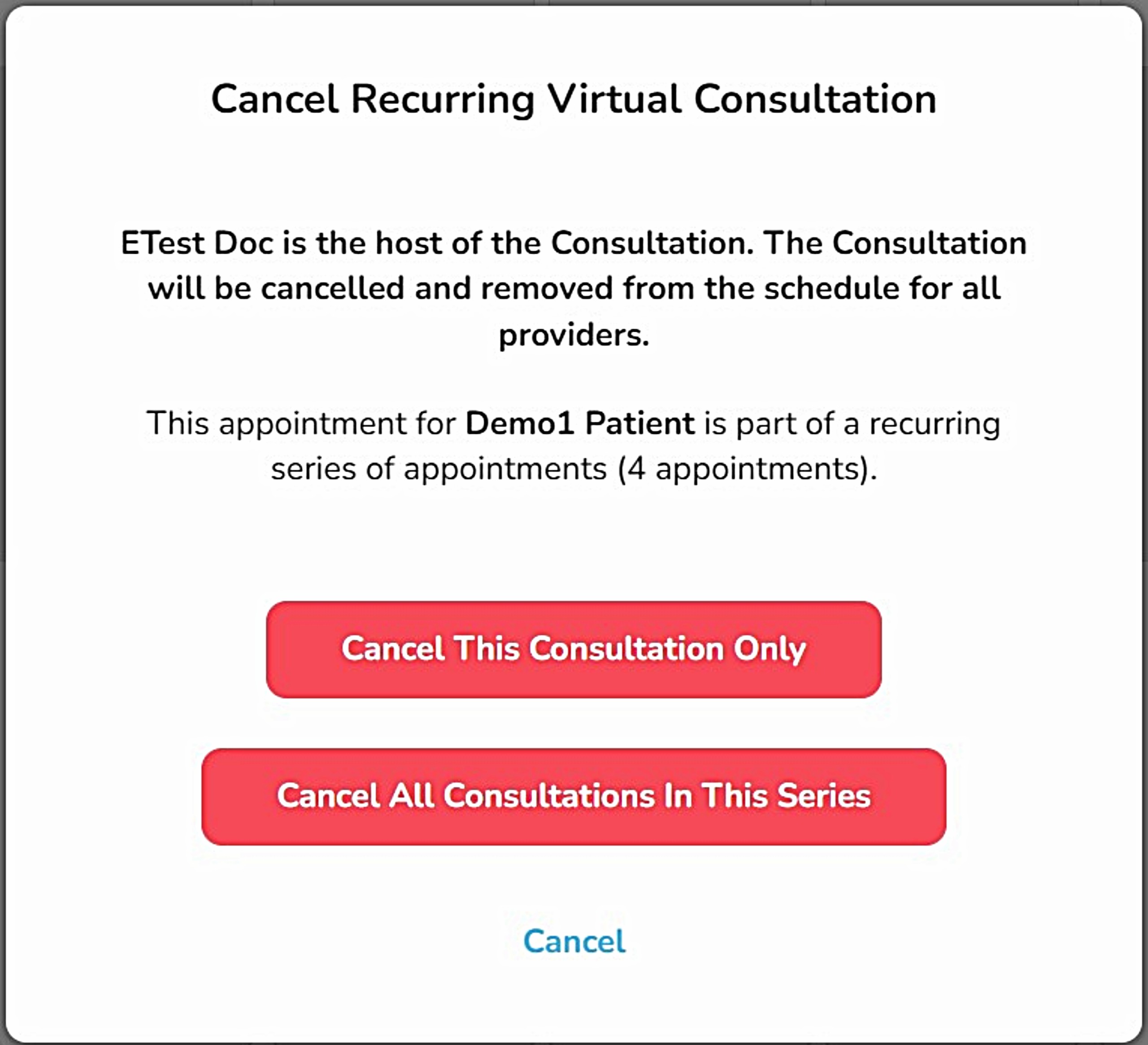 Note: If the scheduled consultations are 'recurring' and you want to cancel all appointments in the series, you can do so from the 'Schedule' tab where you have two options: 'Cancel This Consultation Only' or 'Cancel All Consultations in This Series'.