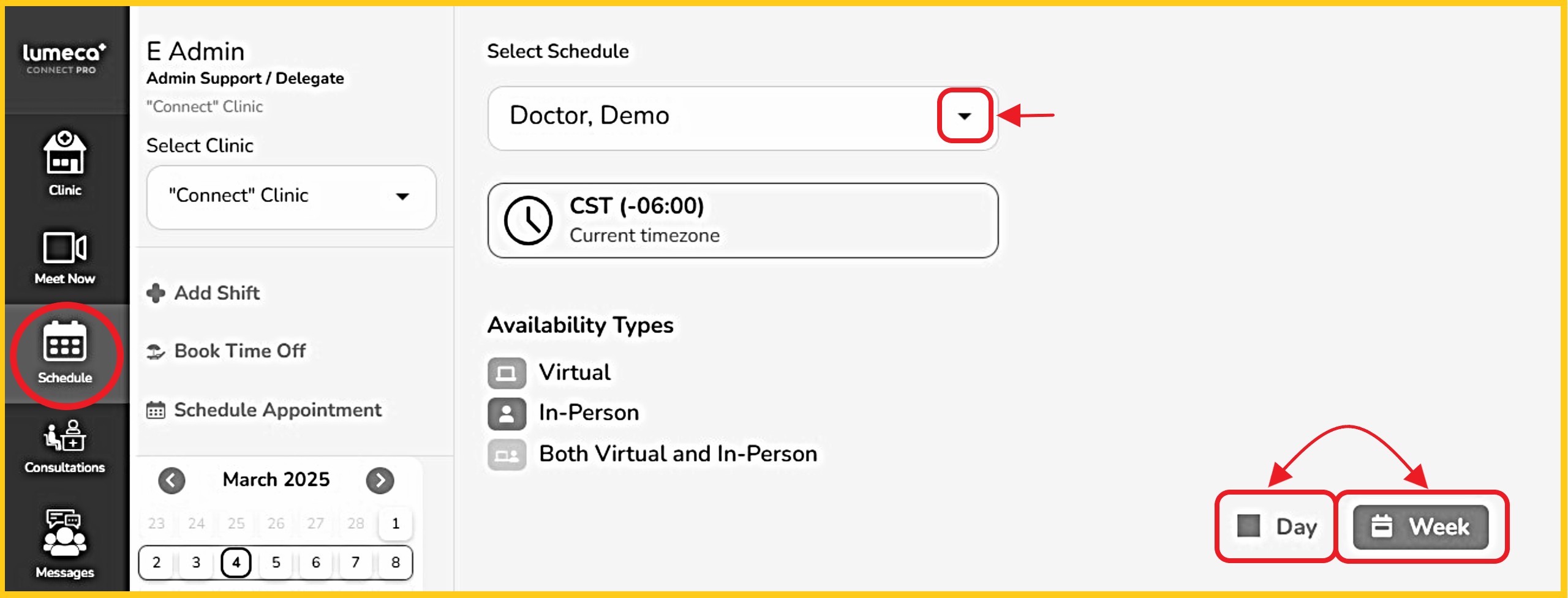 Step 2 - If you are the clinic admin, you must select the provider's name from the 'Select Schedule' dropdown. Clinicians will not see this dropdown.