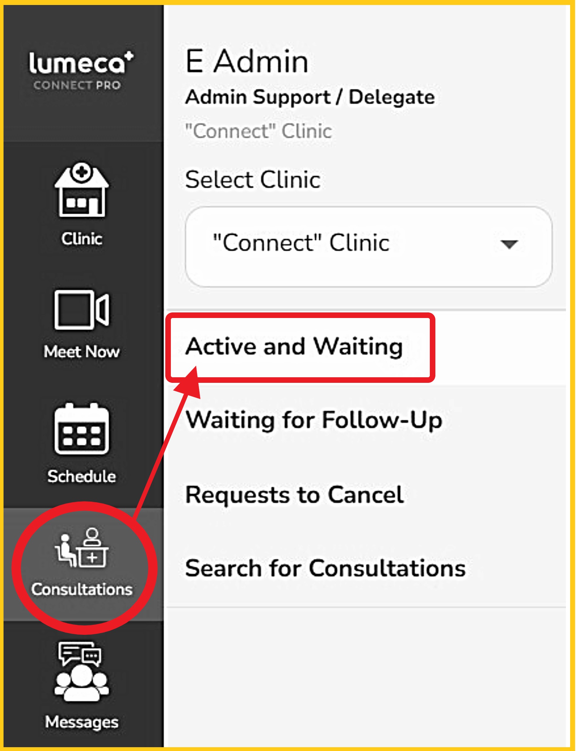 Step 1 - From the left navigation bar, select 'Consultations', then confirm you are on the 'Active and Waiting' screen.