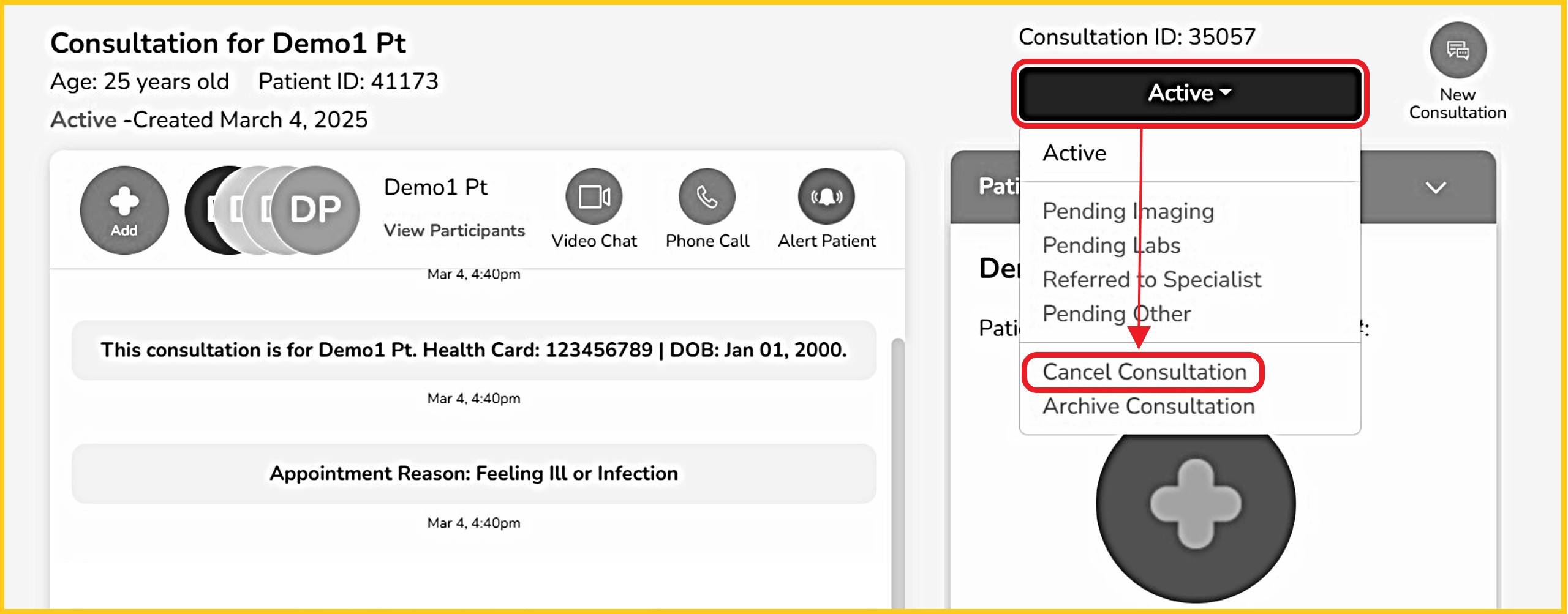 Step 1 - Enter the patient consultation. Above 'Patient Information' on the consultation screen, click on the drop-down menu labelled 'Active'.