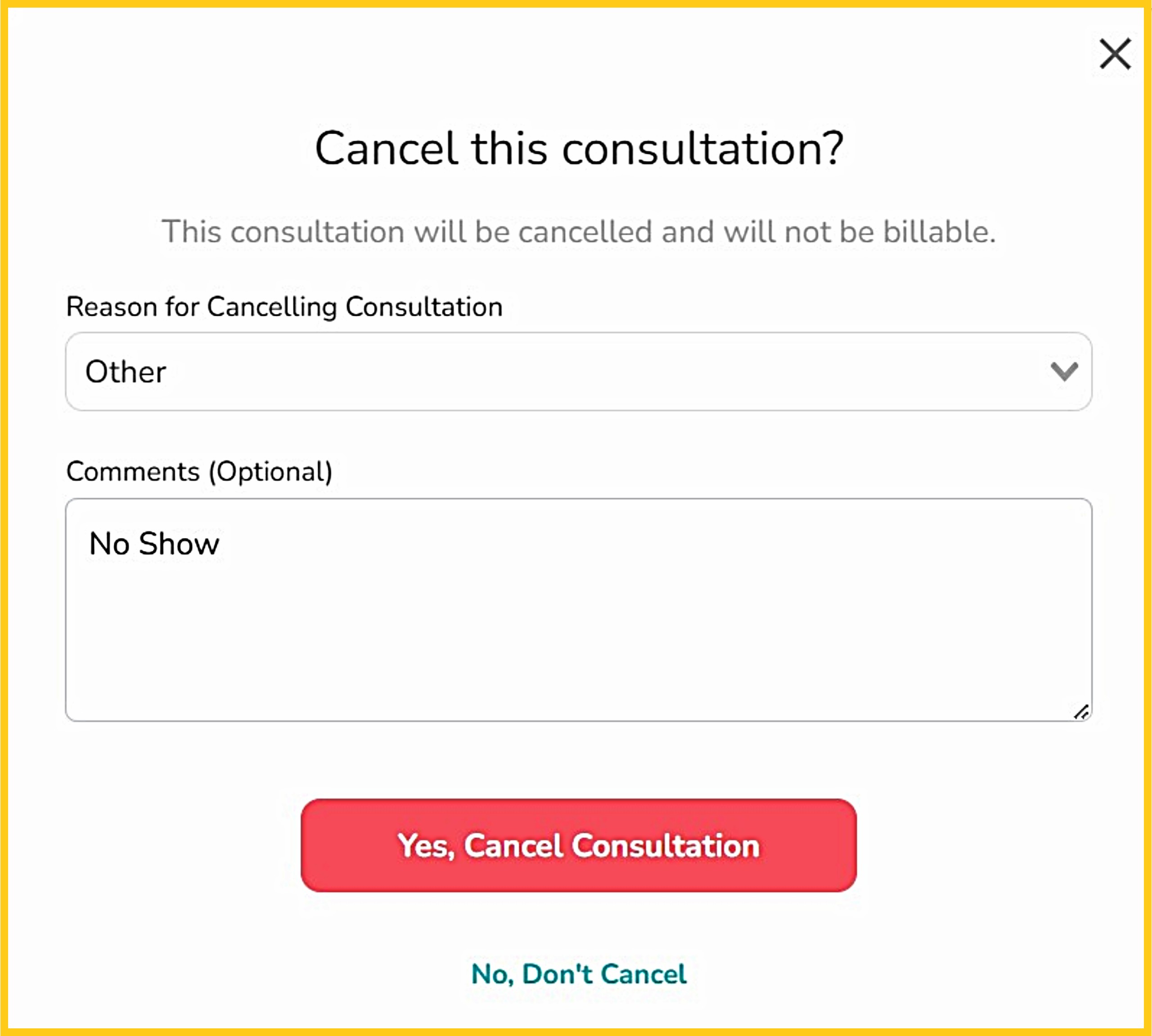 Step 3 - Click the drop-down to select a reason for the cancellation, enter a comment (optional), then click 'Yes, Cancel Consultation'.