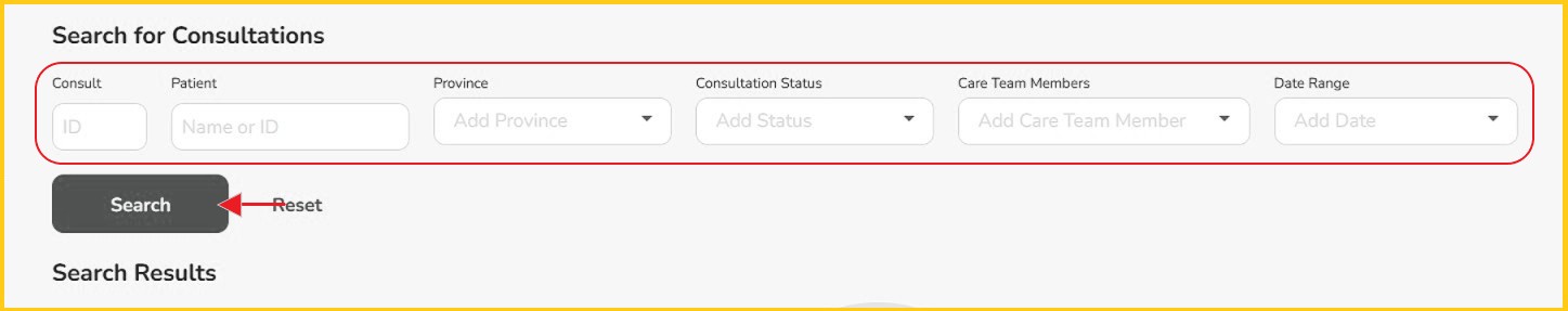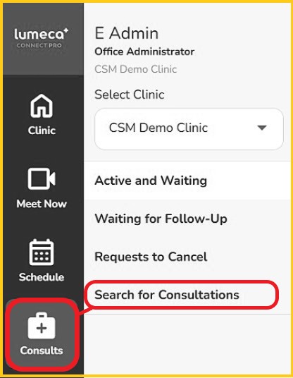 Step 1 - From the left navigation bar, click 'Consultations', then select 'Search for Consultations'.
