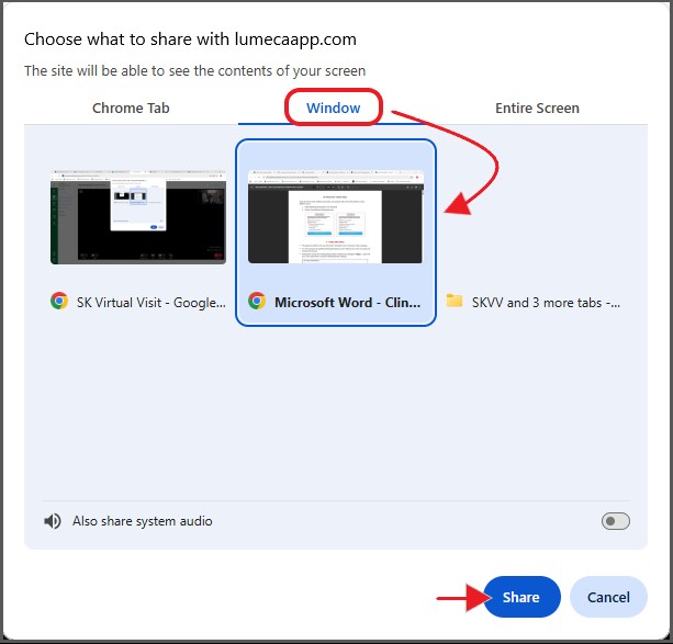 Step 3 - Select the screen or window you wish to share and click 'Share'.