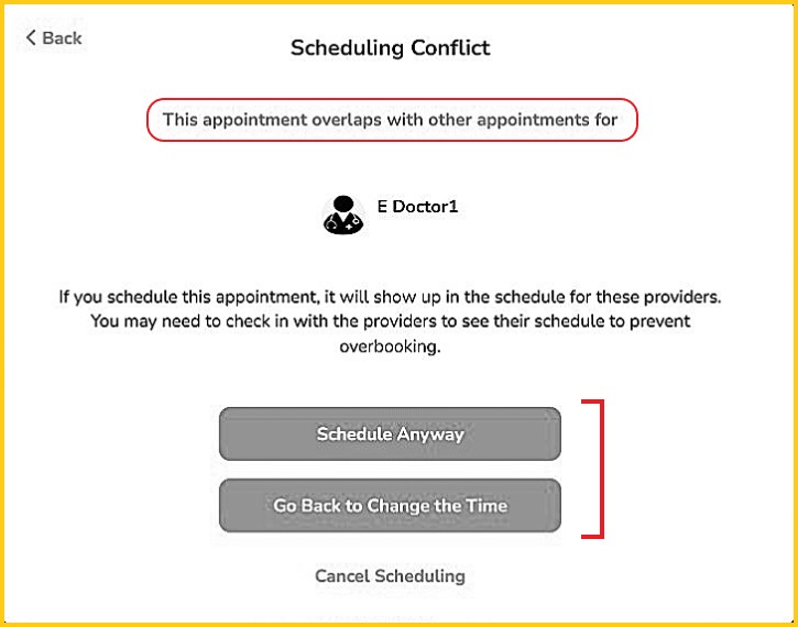 The person doing the scheduling will be prompted at time of booking and will have to confirm whether or not they wish to continue to schedule the overlapping appointment(s) or not: