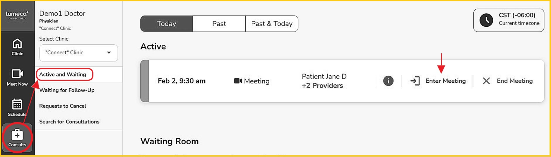- Scheduled Meetings - 'Consults > Active and Waiting'. The meeting will appear under the 'Active' section. Click 'Enter Meeting' to rejoin.