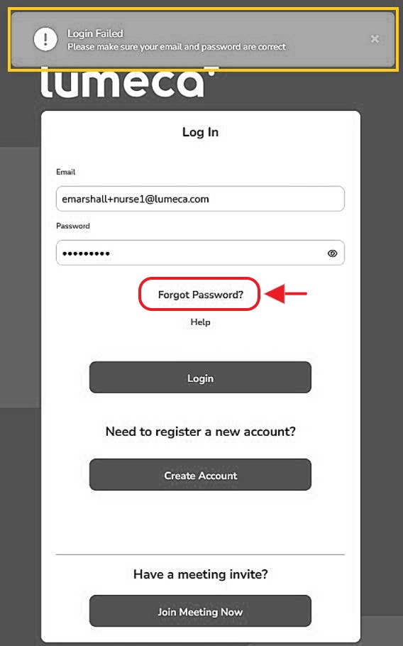 - If your user email address and/or password is not working, click 'Forgot Password?' on the Login screen. Enter your email address and a link will be emailed to you. Go to that new email, click the link within the email and reset your password.