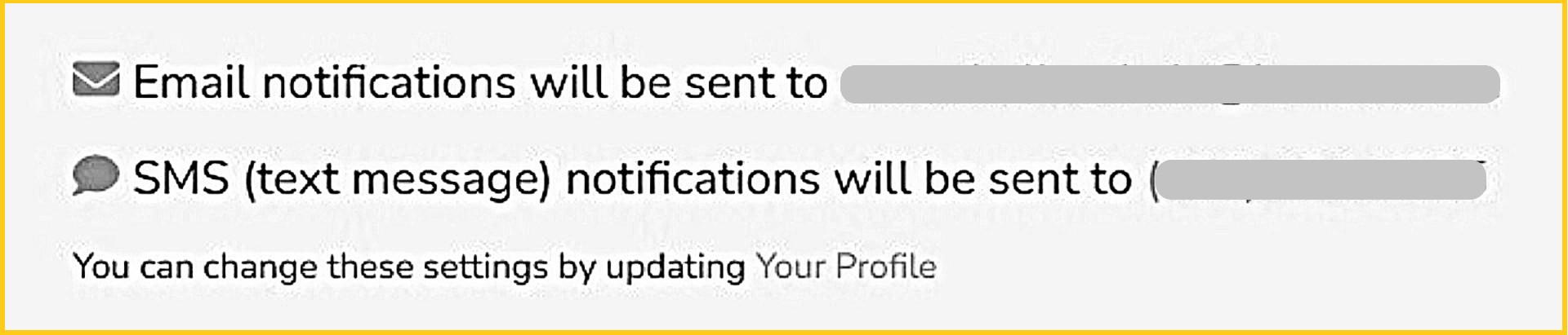 - Notifications will be sent to the email address and mobile number noted at the top of the screen. This information is pulled from the account holder’s 'Profile Information'.