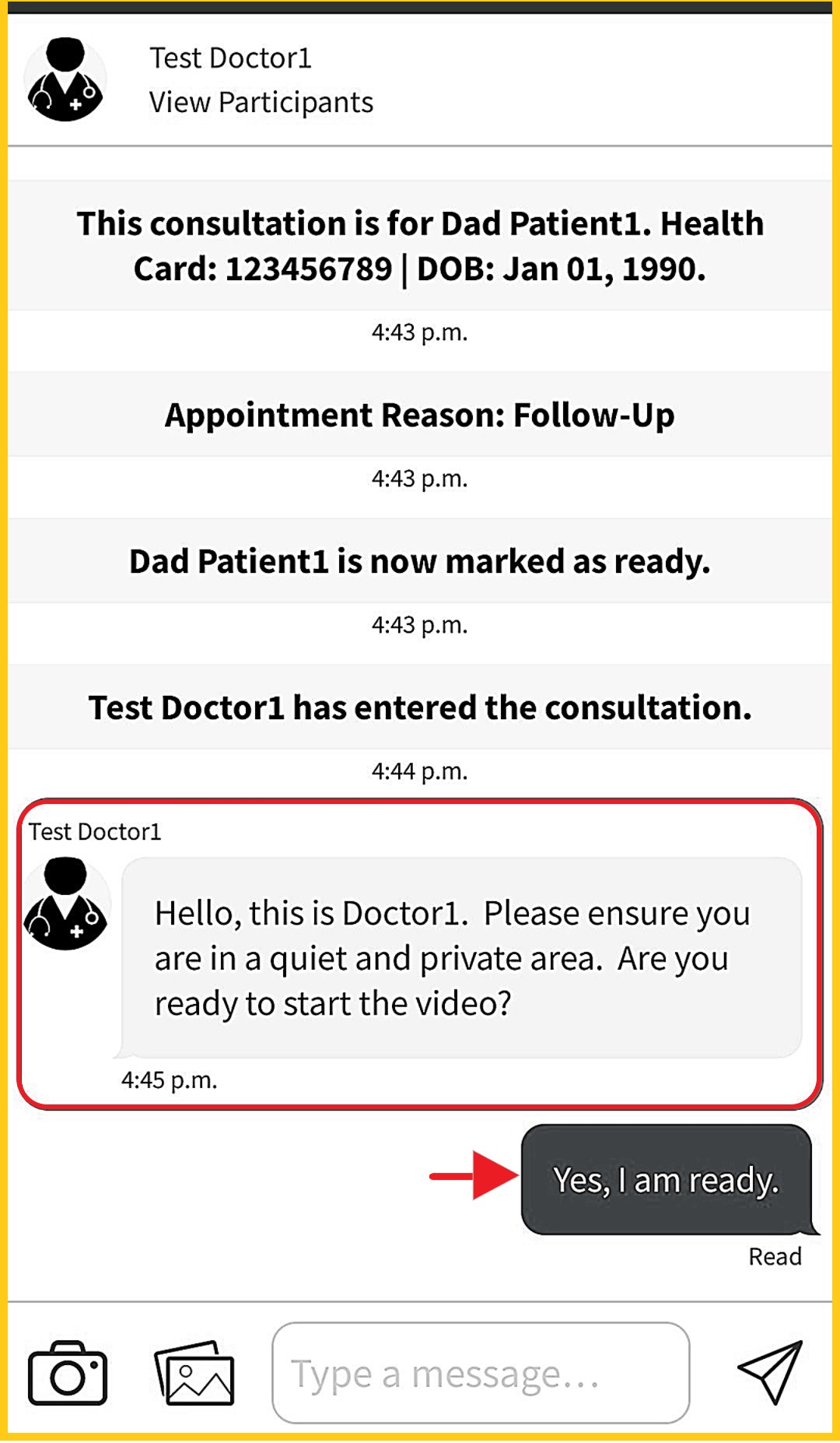 It is important you remain ready and keep waiting until the doctor enters and messages you.
